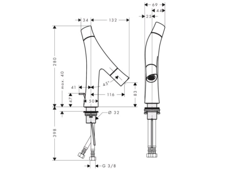 Смеситель для раковины, Hansgrohe, Axor Starck Organic, тип регулирования воды-керамический картридж, отверстия для монтажа-1, высота, мм-280, вынос излива, мм-116, донный клапан-есть, стандарт подвода воды-3/8", цвет-сталь, с двумя рукоятками Смеситель для раковины, Hansgrohe, Axor Starck Organic, цвет-сталь