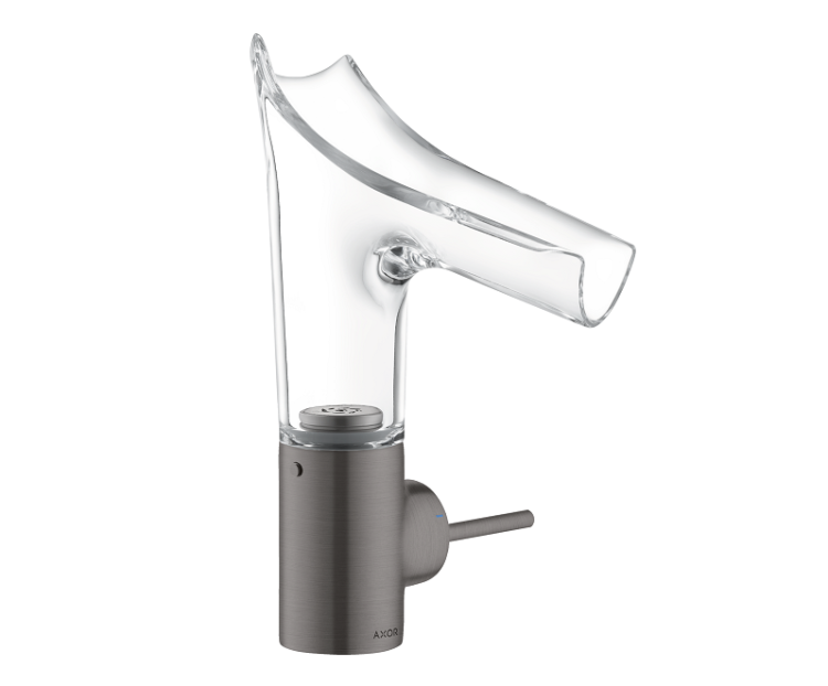 Смеситель для раковины, Hansgrohe, Axor Starck V, тип открывания воды-однорычажный, тип регулирования воды-керамический узел смешивания, отверстия для монтажа-1, высота, мм-251, со стеклянным изливом, материал излива-хрустальное стекло, вынос излива, мм-125, тип излива-поворотный 120° или 145°, вид ручки-джойстикового типа, с возможностью размещения рукоятки справа или слева, стандарт подвода воды-3/8", цвет-шлифованный черный хром Смеситель для раковины, Hansgrohe, Axor Starck V, цвет-шлифованный черный хром