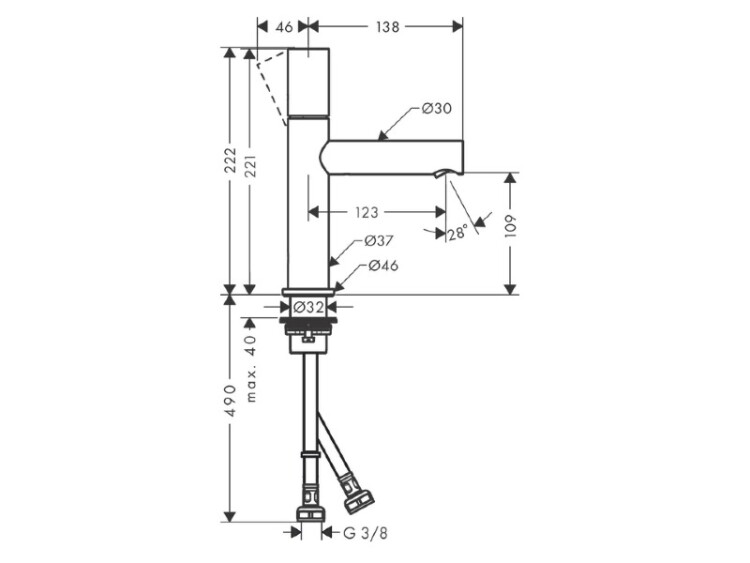 Смеситель для раковины, Hansgrohe, Axor Uno, тип открывания воды-однорычажный, тип регулирования воды-керамический узел смешивания, отверстия для монтажа-1, высота, мм-222, вынос излива, мм-123, вид ручки-zero, тип подводки-гибкая, стандарт подвода воды-3/8", цвет-хром Смеситель для раковины, Hansgrohe, Axor Uno, цвет-хром