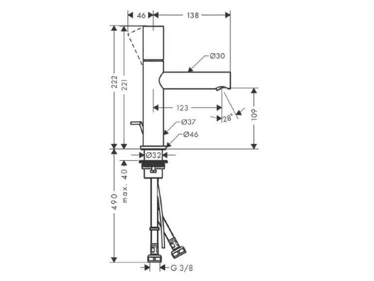 Смеситель для раковины, Hansgrohe, Axor Uno, тип открывания воды-однорычажный, тип регулирования воды-керамический узел смешивания, отверстия для монтажа-1, высота, мм-222, вынос излива, мм-123, вид ручки-zero, донный клапан-есть, тип подводки-гибкая, стандарт подвода воды-3/8", цвет-хром Смеситель для раковины, Hansgrohe, Axor Uno, цвет-хром