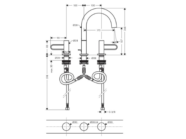 Смеситель для раковины, Hansgrohe, Axor Uno, тип открывания воды-двухрычажный, отверстия для монтажа-3, высота, мм-268, вынос излива, мм-173, вид ручки-петля, донный клапан-есть, стандарт подвода воды-3/8", внутренняя часть-есть, цвет-шлифованное золото Смеситель для раковины, Hansgrohe, Axor Uno, цвет-шлифованное золото