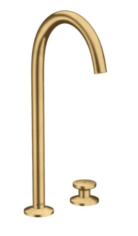Смеситель для раковины, Axor, Axor One, тип открывания воды-однорычажный, монтаж-на раковину/столешницу, отверстия для монтажа-2, высота, мм-353, вынос излива, мм-165, донный клапан-есть, Push-Open, тип подводки-гибкая, стандарт подвода воды-3/8", цвет-золото шлифованное Смеситель для раковины, Axor, Axor One, цвет-золото шлифованное