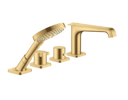 Смеситель для ванны и душа, Axor, Axor Citterio E, тип открывания воды-вентильный, тип регулирования воды-термостатический картридж, монтаж на плитку, отверстия для монтажа-4, вынос излива, мм-190, тип излива-неподвижный, ручной душ-в комплекте, внутренняя часть-необходимо заказать, цвет-золото шлифованное Смеситель для ванны и душа, Axor, Axor Citterio E, цвет-золото шлифованное