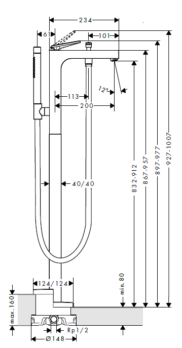Смеситель для ванны и душа, Axor, Citterio, тип открывания воды-однорычажный, тип регулирования воды-керамический картридж, монтаж-напольный, отверстия для монтажа-1, вынос излива, мм-200, тип излива-неподвижный, ручной душ-в комплекте, внутренняя часть-необходимо заказать, цвет-хром черный шлифованный Смеситель для ванны и душа, Axor, Citterio, цвет-хром черный шлифованный