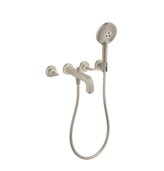 Смеситель для ванны и душа, Axor, Axor Citterio, с керамическими вентилями, тип открывания воды-вентильный, монтаж-настенный встраиваемый, отверстия для монтажа-4, вынос излива, мм-222, в комплекте-ручной душ, форма-круглая, диаметр,мм-120, тип струи ручного душа: Rain, RainAir, WhirlAir, держатель для душа, шланг для душа,мм-1250, дивертер с переключателем вакуумного типа, внутренняя часть-необходимо заказать, цвет-шлифованный никель Смеситель для ванны и душа, Axor, Axor Citterio, цвет-шлифованный никель