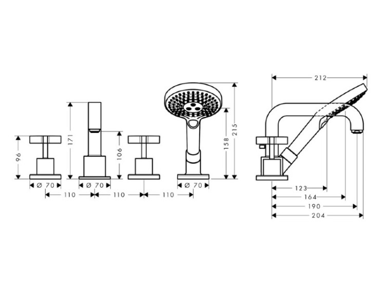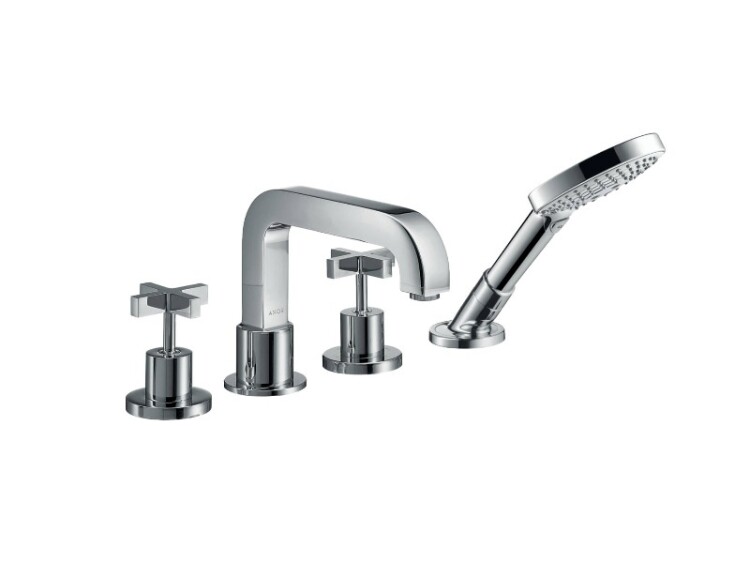 Смеситель для ванны и душа, Hansgrohe, Axor Citterio, тип открывания воды-двухвентильный, тип регулирования воды-керамический узел смешивания, тип установки-на край ванны, отверстия для монтажа-4, вынос излива, мм-190, вид ручки-крестовый, внутренняя часть-необходимо заказать, цвет-хром, в комплекте-встраиваемый держатель ручного душа, вытяжной ручной душ, вид-круглый, размер душевого диска,мм-125, переключение типов струи с помощью кнопки Select, тип струи-Rain, RainAir, WhirlAir, максимальное расстояние, на которое вытягивается ручной душ,мм-1100, переключатель вакуумного типа Смеситель для ванны и душа, Hansgrohe, Axor Citterio, цвет-хром