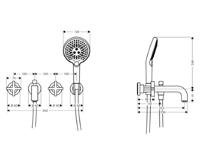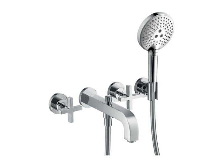 Смеситель для ванны и душа, Hansgrohe, Axor Citterio, тип открывания воды-двухвентильный, тип регулирования воды-керамический узел смешивания, тип установки-встраиваемый, отверстия для монтажа-4, вынос излива, мм-222, вид ручки-крестовый, внутренняя часть-необходимо заказать, цвет-шлифованный черный хром, в комплекте-ручной душ, вид-круглый, размер душевого диска, 125, переключение типов струи с помощью кнопки Select, тип струи-Rain, RainAir, WhirlAir, держатель ручного душа, шланг с металлическим эффектом,мм-1250, переключатель вакуумного типа Смеситель для ванны и душа, Hansgrohe, Axor Citterio, цвет-шлифованный черный хром