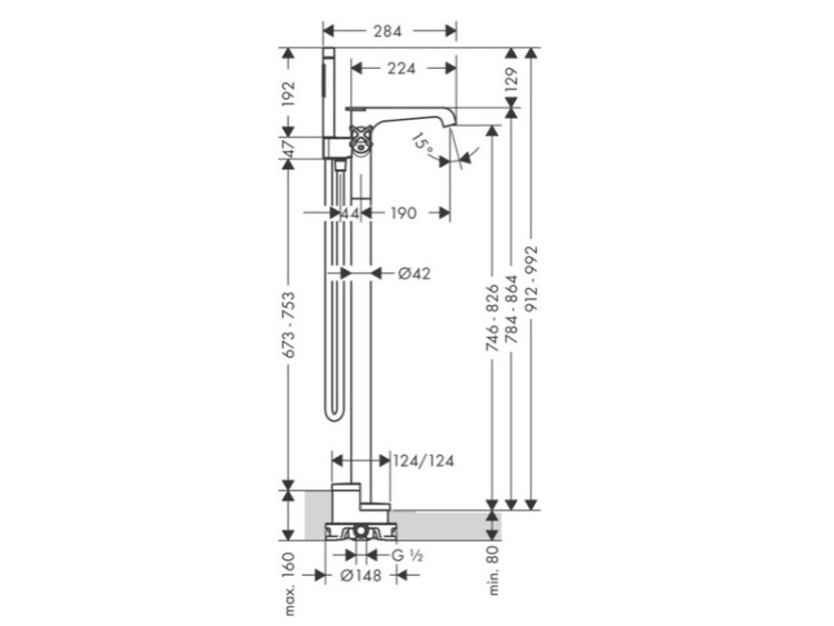 Смеситель для ванны и душа, Hansgrohe, Axor Citterio E, тип открывания воды-двухвентильный, тип регулирования воды-термостатический картридж, тип установки-напольный, отверстия для монтажа-1, вынос излива, мм-225, внутренняя часть-необходимо заказать, цвет-шлифованное красное золото, 2 потребителя, комплектация-ручной душ, вид-цилиндрический, тип струи ручного душа-Rain, Mono, держатель ручного душа, шланг с металлическим эффектом,мм-1250 Смеситель для ванны и душа, Hansgrohe, Axor Citterio E, цвет-шлифованное красное золото