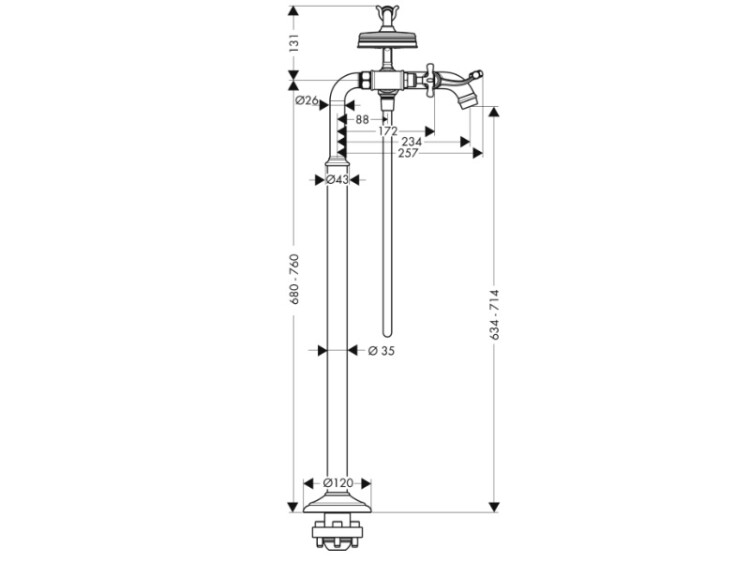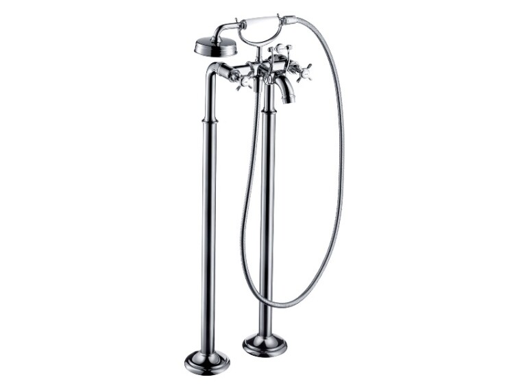 Смеситель для ванны и душа, Hansgrohe, Axor Montreux, тип открывания воды-двухвентильный, тип регулирования воды-керамический узел смешивания, тип установки-напольный, отверстия для монтажа-2, вынос излива, мм-234, внутренняя часть-необходимо заказать, цвет-полированное золото, в комплекте-держатель ручного душа, ручной душ с белой рукояткой, ½’, форма-круглая, размер душевого диска,мм-100, тип струи-RainAir, металлический шланг,мм-1250 Смеситель для ванны и душа, Hansgrohe, Axor Montreux, цвет-полированное золото