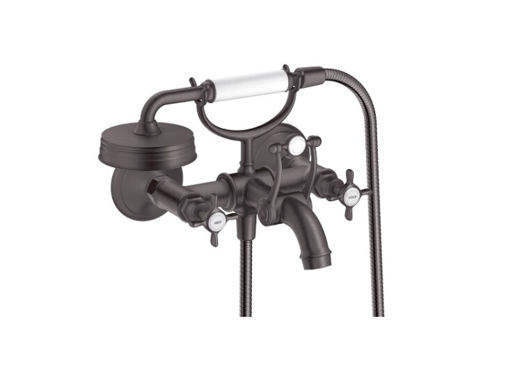 Смеситель для ванны и душа, Hansgrohe, Axor Montreux, тип открывания воды-двухвентильный, тип регулирования воды-керамический узел смешивания, тип установки-настенный, отверстия для монтажа-2, вынос излива, мм-220, цвет-шлифованный черный хром, в комплекте-держатель ручного душа, ручной душ с белой рукояткой, ½’, форма-круглая, размер душевого диска,мм-100, тип струи-RainAir, металлический шланг,мм-1250 Смеситель для ванны и душа, Hansgrohe, Axor Montreux, цвет-шлифованный черный хром