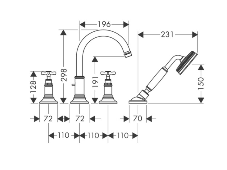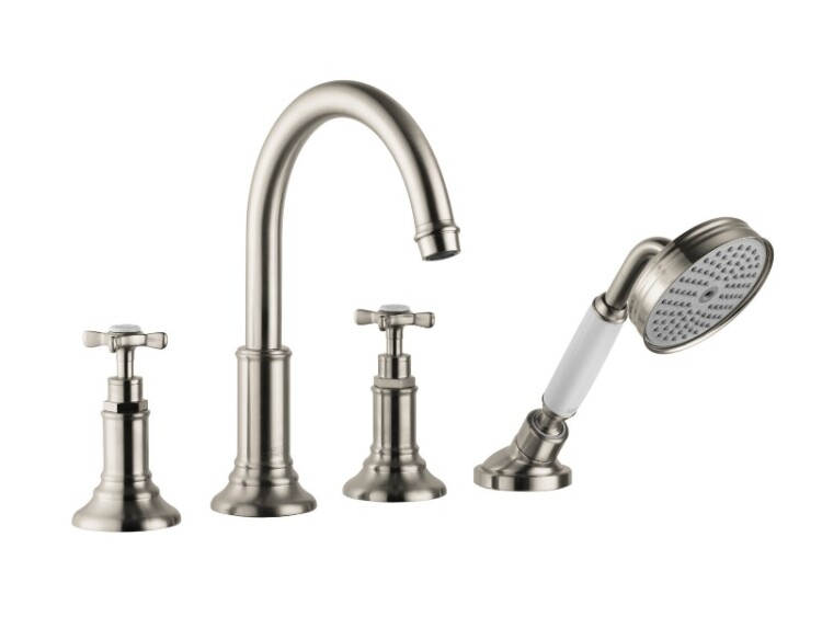 Смеситель для ванны и душа, Hansgrohe, Axor Montreux, тип открывания воды-двухвентильный, тип регулирования воды-керамический узел смешивания, тип установки-на плитку, отверстия для монтажа-4, вынос излива, мм-196, внутренняя часть-необходимо заказать, цвет-шлифованный никель, в комплекте-вытяжной ручной душ с белой рукояткой ½’, форма-круглая, размер душевого диска,мм-100, тип струи: RainAir, максимальное расстояние, на которое вытягивается ручной душ,мм-1100 Смеситель для ванны и душа, Hansgrohe, Axor Montreux, цвет-шлифованный никель