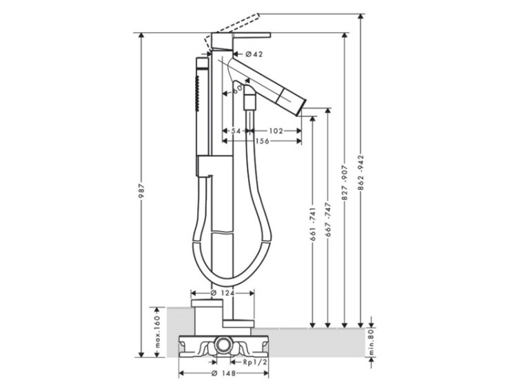 Смеситель для ванны и душа, Hansgrohe, Axor Starck, тип открывания воды-однорычажный, тип регулирования воды-керамический узел смешивания, тип установки-напольный, отверстия для монтажа-1, вынос излива, мм-156, внутренняя часть-необходимо заказать, цвет-шлифованное золото, в комплекте-держатель ручного душа, ручной душ Axor Starck, ½’, форма-цилиндрическая, тип струи-Rain, Mono, шланг с металлическим эффектом,мм-1250 Смеситель для ванны и душа, Hansgrohe, Axor Starck, цвет-шлифованное золото