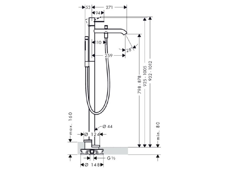Смеситель для ванны и душа, Hansgrohe, Axor Uno, тип открывания воды-однорычажный, тип регулирования воды-керамический узел смешивания, тип установки-напольный, отверстия для монтажа-1, вынос излива, мм-259, вид ручки-петля, внутренняя часть-необходимо заказать, цвет-хром, в комплекте-ручной душ Axor Starck, форма-цилиндрическая, тип струи ручного душа-Rain, Mono, держатель ручного душа, шланг, с металлическим эффектом,мм-1250, переключатель вакуумного типа Смеситель для ванны и душа, Hansgrohe, Axor Uno, цвет-хром
