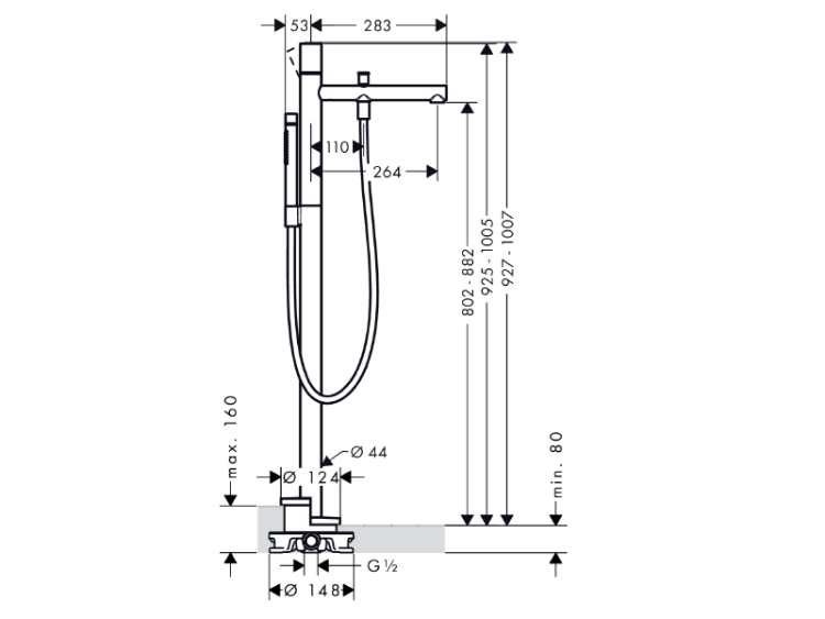 Смеситель для ванны и душа, Hansgrohe, Axor Uno, тип открывания воды-однорычажный, тип установки-напольный, отверстия для монтажа-1, вынос излива, мм-264, вид ручки-zero, внутренняя часть-необходимо заказать, цвет-шлифованное золото, комплектация-переключатель, ручной душ Axor Starck, 2 типа струи - Rain, Mono, держатель душа, шланг 1250 мм Смеситель для ванны и душа, Hansgrohe, Axor Uno, цвет-шлифованное золото