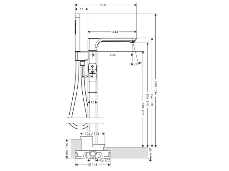 Смеситель для ванны и душа, Hansgrohe, Axor Urquiola, тип регулирования воды-термостатический картридж, тип установки-напольный, отверстия для монтажа-1, вынос излива, мм-204, цвет-хром, запорный и переключающий вентиль, предохранительный ограничитель при 38° C, с автоматическим переключением в исходное положение, встроенный держатель душа, ручной душ-есть, вид-цилиндрический, тип струи-обычная, мягкая, переключение типов струи с помощью вращающегося душевого диска, шланг-есть, длина шланга,мм-1250 Смеситель для ванны и душа, Hansgrohe, Axor Urquiola, цвет-хром