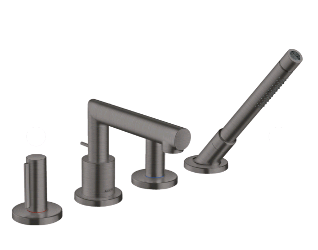 Смеситель для ванны и душа, Axor Uno, тип открывания воды-вентильный, тип регулирования воды-керамическая кран-букса, тип установки-на борт ванны, отверстия для монтажа-4, вынос излива, мм-152, вид ручки-zero, в комплекте-учной душ, встраиваемый держатель душа, максимальное расстояние, на которое вытягивается ручной душ,мм-1100, внутренняя часть-необходимо заказать, цвет-хром черный шлифованный Смеситель для ванны и душа, Axor Uno, цвет-хром черный шлифованный