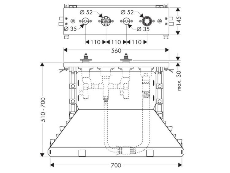 Внутрення часть, Hansgrohe, Axor, назначение-для смесителя для ванны и душа, на 4 отверстия, монтаж на плитку, комплект поставки-скрытая часть, набор шлангов Secuflx, Secubox, монтажная плита, максимальное расстояние, на которое вытягивается ручной душ,мм-1100 Внутрення часть, Hansgrohe, Axor, для смесителя для ванны и душа