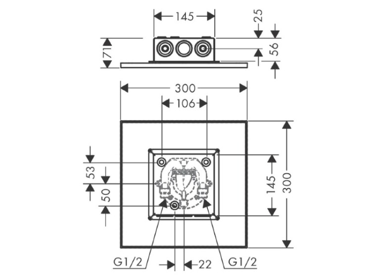 Верхний душ, Axor, Axor Showers, тип установки-потолочный, ширина, мм-300, глубина, мм-300, форма-квадратная, количество режимов-1, тип струи-PowderRain, внутренняя часть-необходимо заказать, цвет-полированное золото, материал-металл, выдвигающиеся форсунки Верхний душ, Axor, Axor Showers, шг 300*300, цвет-полированное золото