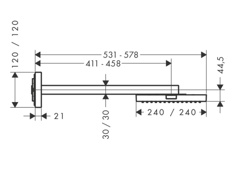 Верхний душ, Hansgrohe, Axor ShowerSolutions, тип установки-настенный, ширина, мм-240, глубина, мм-531-578, высота, мм-120, форма-квадратная, количество режимов-1, тип струи-RainAir, держатель-есть, размер держателя-411-458, внутренняя часть-необходимо заказать, цвет-шлифованное золото, размер душевого диска,мм-240*240*44,5, материал-металл Верхний душ, Hansgrohe, Axor ShowerSolutions, шгв 240*531-578*120, цвет-шлифованное золото