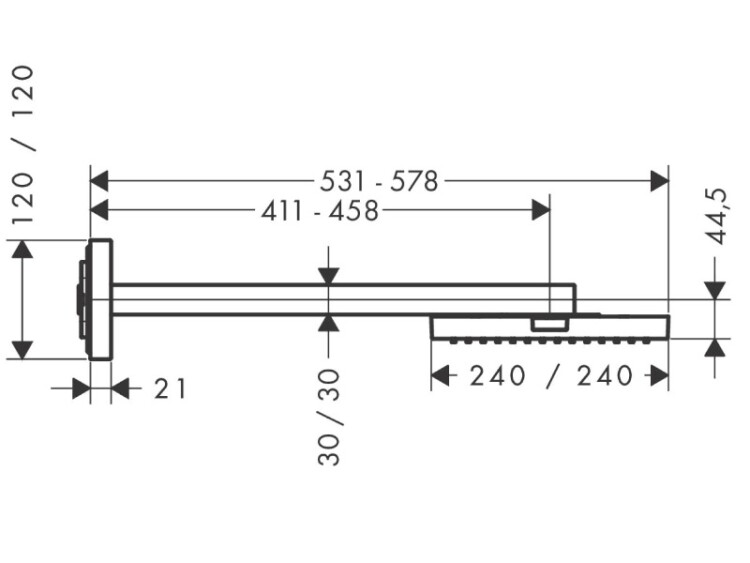 Верхний душ, Hansgrohe, Axor ShowerSolutions, тип установки-настенный, ширина, мм-240, глубина, мм-531-578, высота, мм-120, форма-квадратная, количество режимов-1, тип струи-RainAir, держатель-есть, размер держателя-411-458, внутренняя часть-необходимо заказать, цвет-шлифованный никель, размер душевого диска,мм-240*240*44,5, материал-металл Верхний душ, Hansgrohe, Axor ShowerSolutions, шгв 240*531-578*120, цвет-шлифованный никель