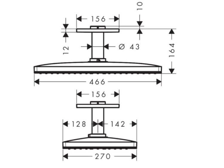 Верхний душ, Axor, Axor ShowerSolutions, тип установки-потолочный, ширина, мм-466, глубина, мм-270, высота, мм-164, форма-прямоугольная, количество режимов-1, тип струи-Rain, держатель-есть, размер держателя-100, внутренняя часть-необходимо заказать, цвет-хром, материал-металл, душевой диск-хромированный Верхний душ, Axor, Axor ShowerSolutions, шгв 466*270*164, цвет-хром