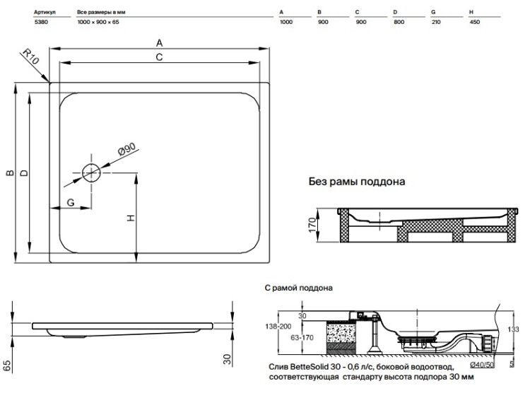 Душевой поддон, Bette, BetteSupra, ширина, мм-1000, глубина, мм-900, высота, мм-65, форма-прямоугольная, сифон-необходимо заказать, диаметр слива, мм-90, ножки-необходимо заказать, с антислипом BetteАнтислип Pro, цвет-белый, включает звукопоглощающие пластины для снижения уровня шума Душевой поддон, Bette, BetteSupra, шгв 1000*900*65, с антислипом BetteАнтислип Pro, цвет-белый
