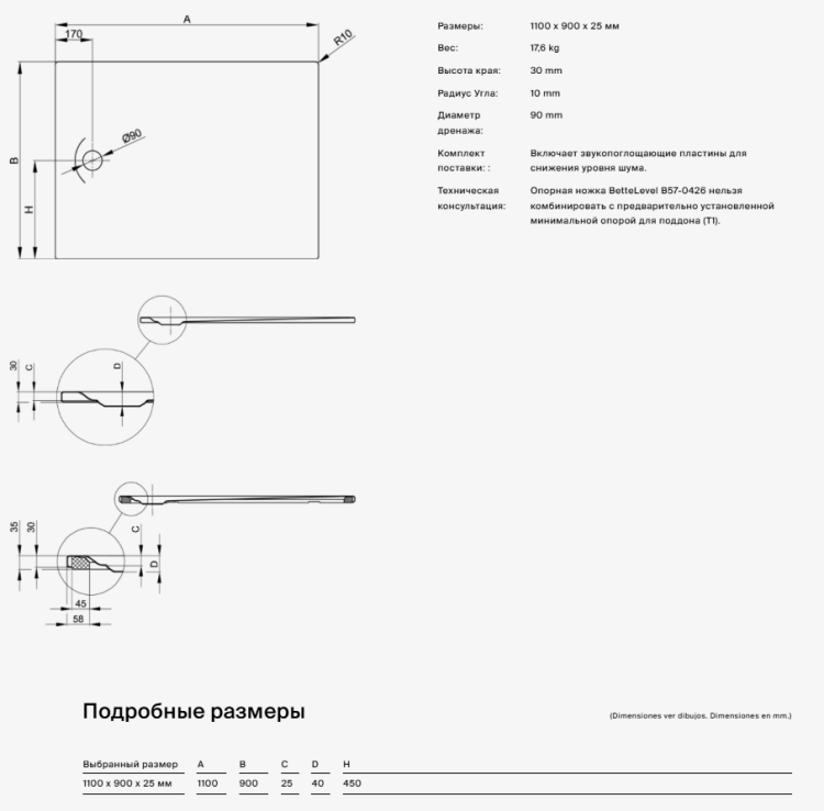 Душевой поддон, Bette, BetteUltra Space, тип установки-напольный, ширина, мм-1100, глубина, мм-900, высота, мм-25, форма-прямоугольная, радиус, мм-10, сифон-необходимо заказать, диаметр слива, мм-90, с антислипом-BetteАнтислип Sense, включает звукопоглощающие пластины для снижения уровня шума, ножки-необходимо заказать, материал-сталь, с антислипом, цвет-белый Душевой поддон, Bette, BetteUltra Space, шгв 1100*900*25, с антислипом, цвет-белый