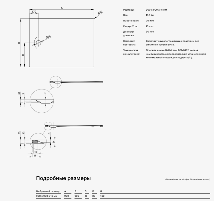 Душевой поддон, Bette, BetteUltra Space, тип установки-напольный, ширина, мм-900, глубина, мм-900, высота, мм-15, форма-прямоугольная, радиус, мм-10, сифон-необходимо заказать, диаметр слива, мм-90, с антислипом-BetteАнтислип Sense, включает звукопоглощающие пластины для снижения уровня шума, ножки-необходимо заказать, материал-сталь, цвет-белый Душевой поддон, Bette, BetteUltra Space, шгв 900*900*15, с антислипом, цвет-белый