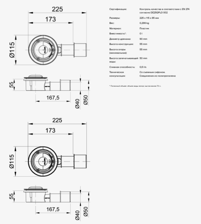 Слив, Bette, BetteCompact+, для душевых поддонов, диаметр слива, мм-90, направление слива-боковое, высота водяного затвора-50 мм, пропускная способность 0,5 литра в секунду, с BetteАнтислип Sense, цвет-белый Слив, Bette, BetteCompact+, для душевых поддонов, цвет-белый