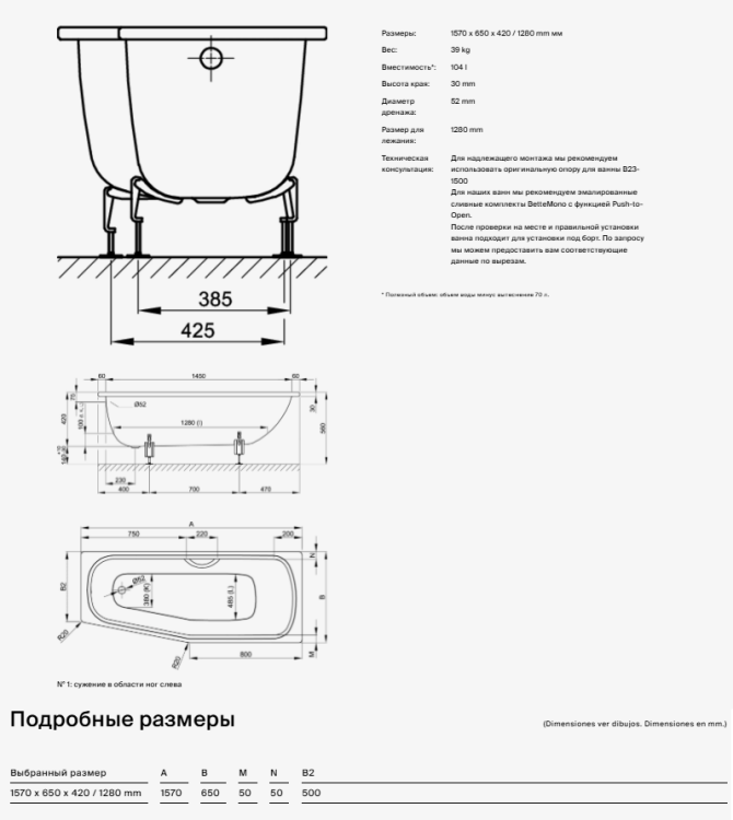 Ванна, Bette, BetteBambino, ширина, мм-1570, глубина, мм-650, высота, мм-420, водоизмещение (л)-104, тип установки-встраиваемый, форма-ассиметричная, слив-перелив-необходимо заказать, диаметр слива, мм-52, ножки-необходимо заказать, материал-сталь, цвет-белый Ванна, Bette, BetteBambino, шгв 1570*650*420, цвет-белый
