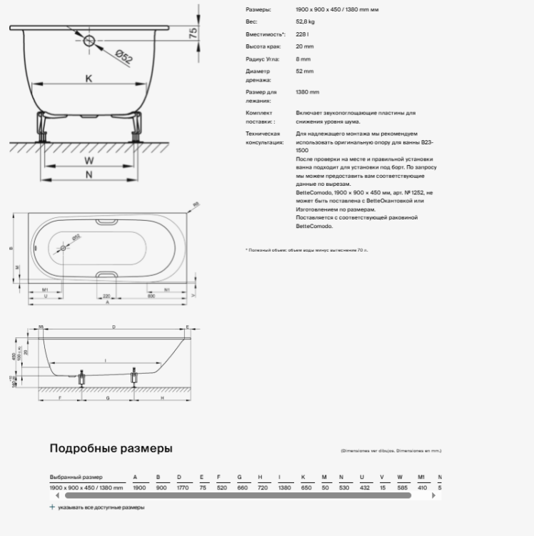 Ванна, Bette, BetteComodo, ширина, мм-1900, глубина, мм-900, высота, мм-450, водоизмещение (л)-228, форма-овальная, слив-перелив-необходимо заказать, диаметр слива, мм-52, ножки-необходимо заказать, грязеотталкивающее покрытие-есть, включает звукопоглощающие пластины для снижения уровня шума, цвет-белый Ванна, Bette, BetteComodo, шгв 1900*900*450, цвет-белый