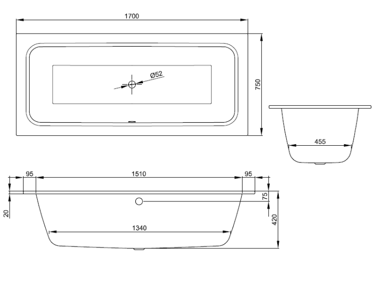 Ванна, Bette, BetteOne, ширина, мм-1700, глубина, мм-750, высота, мм-420, водоизмещение (л)-129, тип установки-встраиваемый, форма-прямоугольная, слив-перелив-необходимо заказать, диаметр слива, мм-52, ножки-необходимо заказать, материал-сталь, цвет-белый Ванна, Bette, BetteOne, шгв 1700*750*420, цвет-белый