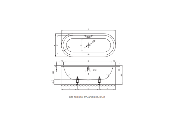 Ванна, Bette, BetteStarlet Flair Oval, ширина, мм-1580, глубина, мм-680, высота, мм-420, водоизмещение (л)-116, форма-овальная, слив-перелив-необходимо заказать, диаметр слива, мм-52, ножки-необходимо заказать, цвет-белый Ванна, Bette, BetteStarlet Flair Oval, шгв 1580*680*420, цвет-белый