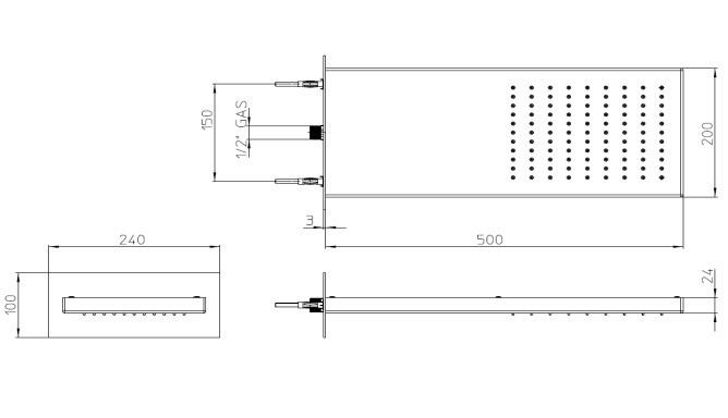 Верхний душ, Bossini, MANHATTAN, тип установки-настенный, размер душевого диска, мм-200*500*24, форма-прямоугольная, количество режимов-1, тип струи-дождь (Rain), держатель-в комплекте, цвет-хром Верхний душ, Bossini, MANHATTAN, 200*500*24, цвет-хром
