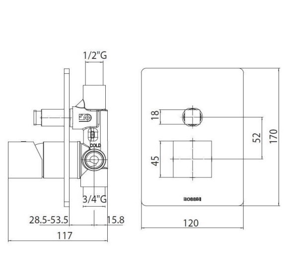 Смеситель для душа, Bossini, CUBE, тип открывания воды-однорычажный, тип регулирования воды-керамический картридж, монтаж-настенный встраиваемый, отверстия для монтажа-1, внутренняя часть-необходимо заказать, с девиатором 2 направления, цвет-хром Смеситель для душа, Bossini, CUBE, цвет-хром