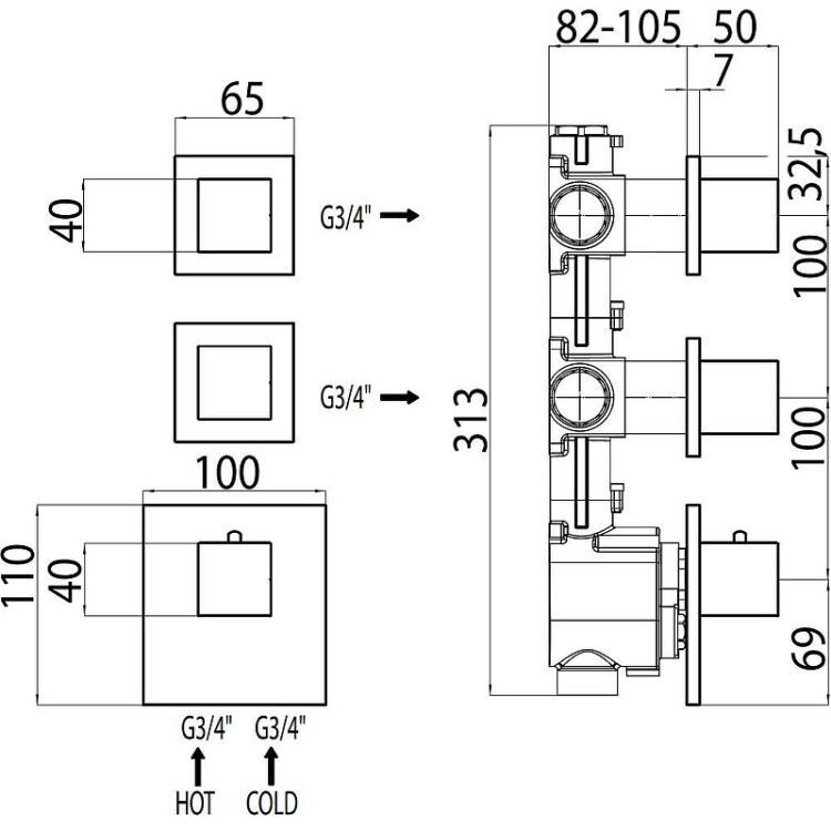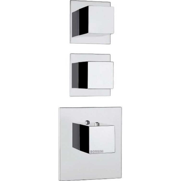 Смеситель для душа, Bossini, CUBE, HighFlow, тип регулирования воды-термостатический картридж, монтаж-настенный встраиваемый, отверстия для монтажа-3, внутренняя часть-необходимо заказать, с отдельными панелями, квадратная рукоятка, установка вертикальная/горизонтальная, цвет-хром Смеситель для душа, Bossini, CUBE, HighFlow, цвет-хром