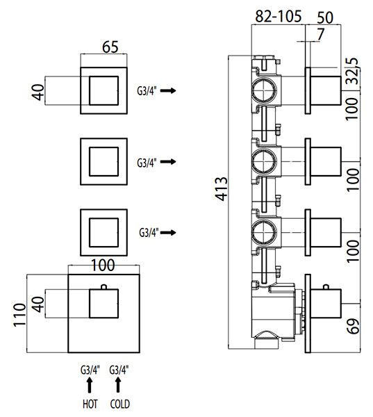 Смеситель для душа, Bossini, CUBE, HighFlow, тип регулирования воды-термостатический картридж, монтаж-настенный встраиваемый, отверстия для монтажа-4, внутренняя часть-необходимо заказать, с отдельными панелями, квадратная рукоятка, установка вертикальная/горизонтальная, цвет-хром Смеситель для душа, Bossini, CUBE, HighFlow, цвет-хром