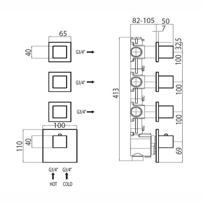 Смеситель для душа, Bossini, Rectangular, HighFlow, тип регулирования воды-термостатический картридж, монтаж-настенный встраиваемый, отверстия для монтажа-4, внутренняя часть-необходимо заказать, с отдельными панелями, плоская рукоятка, установка вертикальная/горизонтальная, цвет-хром Смеситель для душа, Bossini, Rectangular, HighFlow, цвет-хром