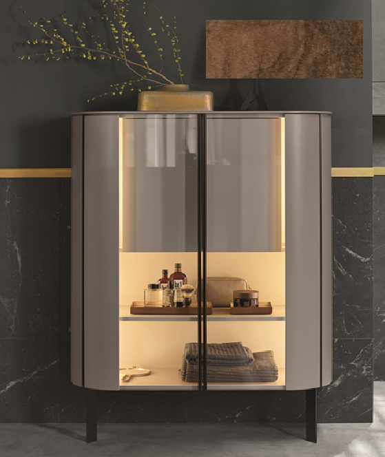 ТумТумба, Burg, Lavo 2.0, ширина, мм-1010, глубина, мм-415, высота, мм-1365, тип установки-напольный, дверцы-есть, 2 прозрачные термоформованные стеклянные, 1 стационарная полка, 1 стационарная полка, 2 алюминиевые ножки черные, 1 рабочая поверхность, внутреннее светодиодное освещение, 20 Вт, 4250 К, 1 датчик движения, ручка-вертикальная, черная (G0227), цвет-Velvet walnut decor Тумба, Burg, Lavo 2.0, шгв 1010*415*1365, цвет-Velvet walnut decor
