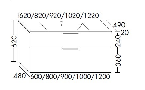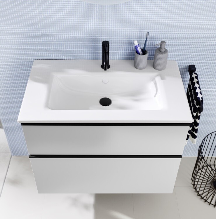 Тумба под раковину, Burg, Eqio, ширина, мм-820, глубина, мм-490, высота, мм-640, тип установки-подвесной, раковина-есть, глубина раковины-130 мм, количество раковин в комплекте-1, монтаж раковины-встраиваемый сверху, материал-керамика, цвет раковины-белый глянцевый, вырез под смеситель-один, ящики-2, верхний ящик глубиной 350 мм, с вырезом под сифон и внутренней перегородкой, выдвижной нижний ящик глубиной 420 мм, вид ручки-длинная линейная, цвет ручки-черный матовый (G0252), материал корпуса-МДФ меламин, материал фасада-МДФ, цвет-белый матовый Тумба под раковину, Burg, Eqio, шгв 820*490*640, раковина в комплекте, цвет-белый матовый