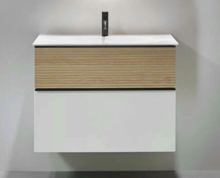 Тумба под раковину, Burg, Fiumo, ширина, мм-820, глубина, мм-490, высота, мм-610, тип установки-подвесной, раковина-есть, количество раковин в комплекте-1, материал-минеральное литье, габариты раковины,мм-590*315*100, вырез под смеситель-один, ящики-2, верхний ящик с вырезом для сифона, верхний фасад с плиссированной передней частью, цвет верхнего фасада-Cashmere oak decor, цвет нижнего фасада-белый матовый, цвет ручки-Matt black Тумба под раковину, Burg, Fiumo, шгв 820*490*610, раковина-в комплекте, цвет-белый матовый/Cashmere oak decor