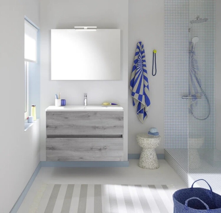Тумба под раковину, Burg, Rocio, ширина, мм-970, глубина, мм-440, высота, мм-640, тип установки-подвесной, раковина-необходимо заказать, вырез под раковину-один, монтаж раковины-встраиваемый, вырез под смеситель-отсутствует, ящики-2, верхний ящик с вырезом под сифон, цвет ручки-в цвет мебели, материал корпуса-ДСП меламиновая смола, материал фасада-ДСП меламиновая смола, цвет-дуб декор сильвер Тумба под раковину, Burg, Rocio, шгв 970*440*640, раковина-необходимо заказать, цвет-дуб декор сильвер