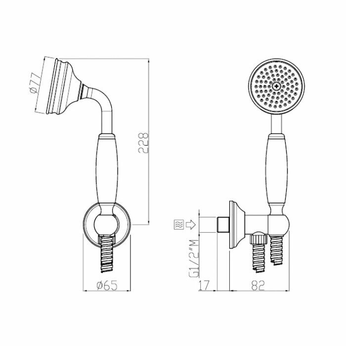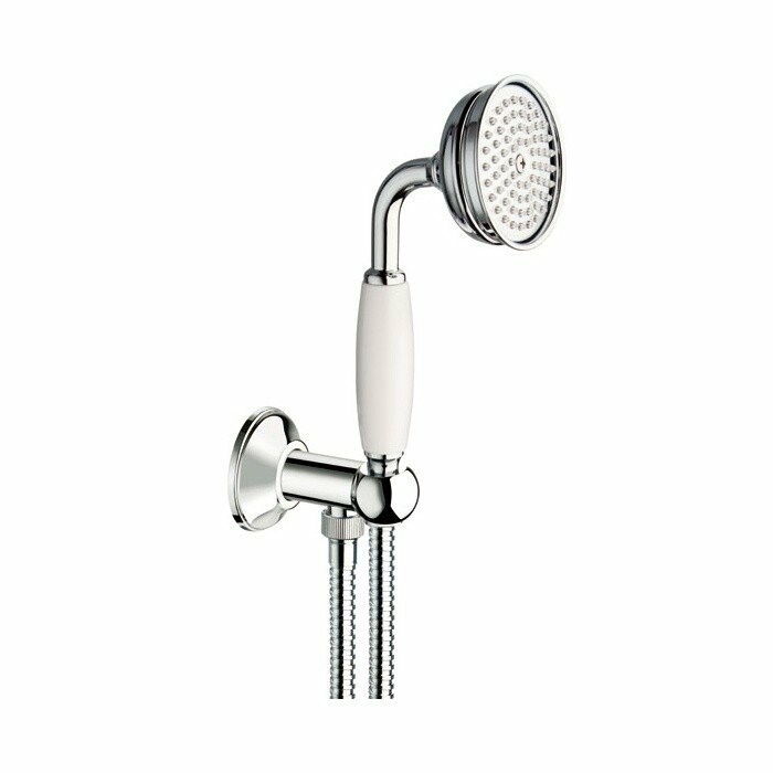 Душевой набор, Carimali, Colonial, размер душевого диска, мм-77, форма лейки-круглая, количество режимов-1, держатель для душа-есть, шланг-есть, длина шланга, мм-1500, шланговое подключение-есть, материал-латунь, с пластмассовой ручкой, цвет-хром Душевой набор, Carimali, Colonial, цвет-хром