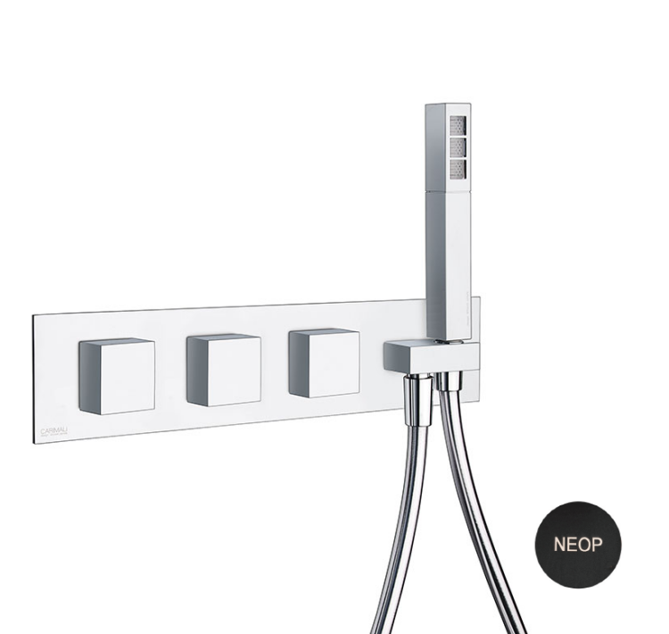 Смеситель для душа, Carimali, IlQuadro, на 4 потребителя, тип открывания воды-вентильный, монтаж-настенный встраиваемый, отверстия для монтажа-4, внутренняя часть-необходимо заказать, в комплекте-одноструйный душ Stilo из латуни, шланговое подключение с держателем для ручного душа, гибкий шланг ПВХ, мм-1500, входы G 1/2’’, цвет-черный матовый Смеситель для душа, Carimali, IlQuadro, на 4 потребителя, цвет-черный матовый
