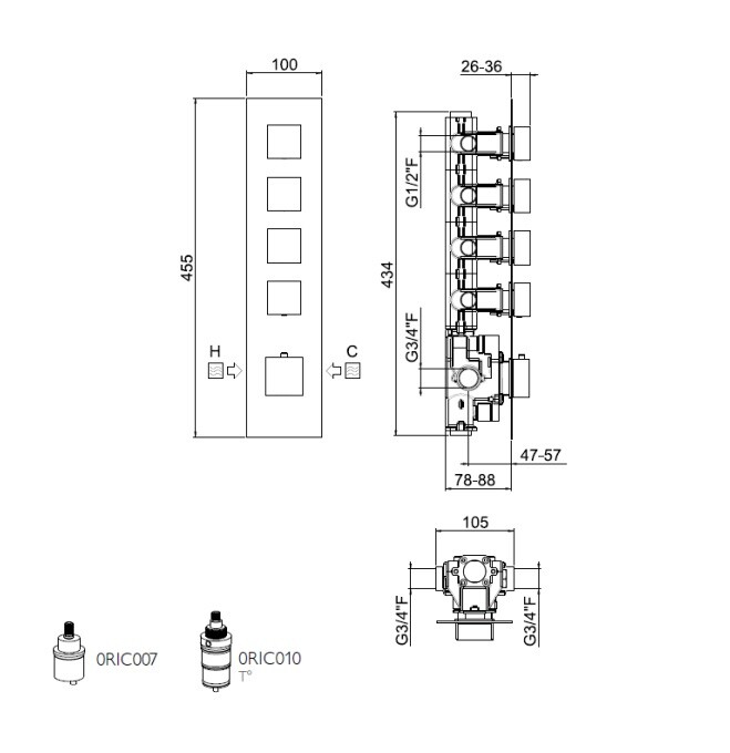 Смеситель для душа, Carimali, ILTONDO, на 4 потребителя, тип открывания воды-однорычажный, тип регулирования воды-термостатический картридж, монтаж-настенный встраиваемый, установка-горизонтальная, квадратная эстетическая панель, внутренняя часть-необходимо заказать, цвет-хром Смеситель для душа, Carimali, ILTONDO, на 2 потребителя, цвет-хром
