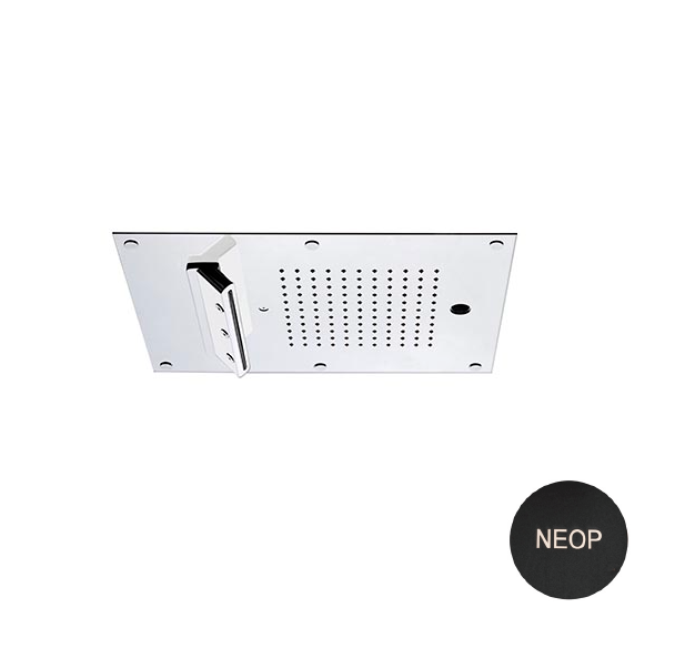 Верхний душ, Carimali, MYDREAM, тип установки-потолочный встраиваемый, размер душевого диска, мм-450*300, форма-прямоугольная, 121 силиконовые форсунки, 2 наружние форсунки, количество режимов-3, тип струи-дождь, одинарный каскад, распыление, с хромотерапией, подсветка-1 RGB светодиодный прожектор, переключатель для хромотерапии-необходимо заказать цвет-черный матовый Верхний душ, Carimali, MYDREAM, 450*300, цвет-черный матовый