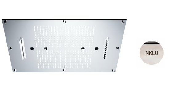 Верхний душ, Carimali, New Mydream, тип установки-потолочный встраиваемый, размер душевого диска, мм-700*500, форма-прямоугольная, количество режимов-4, тип струи-дождь (484 форсунки), каскад водопад (2 шт.), туман (2 форсунки), включает хромотерапию, 2 направленных светильника RGB-светодиоды, система легкой очистки, силиконовые отверстия с защитой от известкового налета, цвет-никель полированный Верхний душ, Carimali, New Mydream, 700*500, цвет-никель полированный