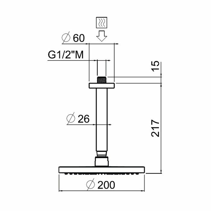 Верхний душ, Carimali, Stick, тип установки-потолочный, размер душевого диска, мм-200*200, форма-круглая, количество режимов-1, тип струи-дождь (Rain), материал насадки-ABS, держатель латунный-в комплекте, размер держателя, мм-150, цвет-хром Верхний душ, Carimali, Stick, 200*200, цвет-хром