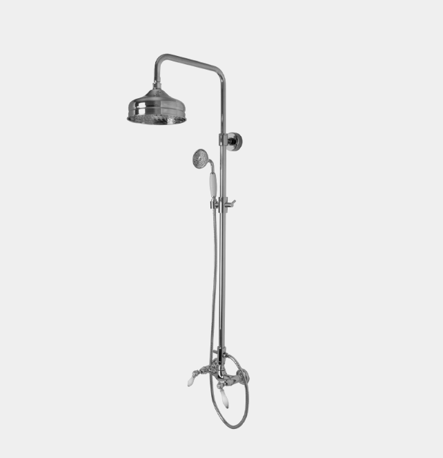 Душевая стойка, Fima Carlo Frattini, Herend, смеситель-в комплекте, тип открывания воды-вентильный, тип регулирования воды-керамическая кран-букса, цвет ручек-белый, материал ручек-мрамор, переключатель-есть, верхний душ-есть, форма верхнего душа-круглая, размер верхнего душа,мм-200, держатель верхнего душа-есть, вынос, мм-300, размер штанги, мм-992, ручной душ-в комплекте, шланг-есть, размер шланга, мм-1500, цвет-хром Душевая стойка, Fima Carlo Frattini, Herend, цвет-хром/белый