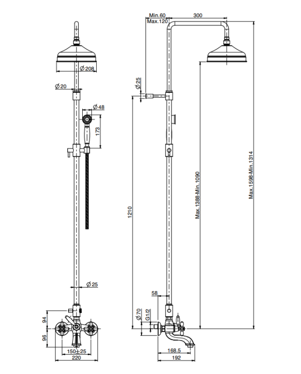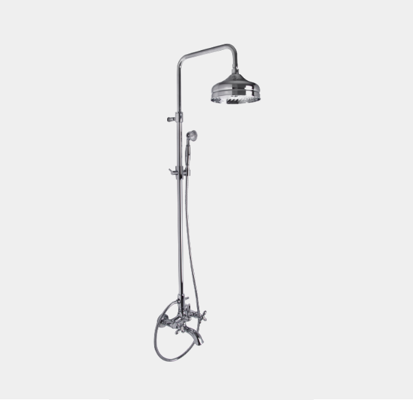 Душевая стойка, Fima Carlo Frattini, Olivia, смеситель-в комплекте, тип открывания воды-вентильный, тип регулирования воды-керамическая кран-букса, излив-есть, вынос излива, мм-168,5, верхний душ-есть, форма верхнего душа-круглая, размер верхнего душа,мм-200, держатель верхнего душа-есть, вынос, мм-300, размер штанги регулируемой, мм-1314-1598, ручной душ-в комплекте, шланг-есть, размер шланга, мм-1500, 2 подвода воды 1/2 с эксцентриком, цвет-бронза античная Душевая стойка, Fima Carlo Frattini, Olivia, цвет-бронза античная
